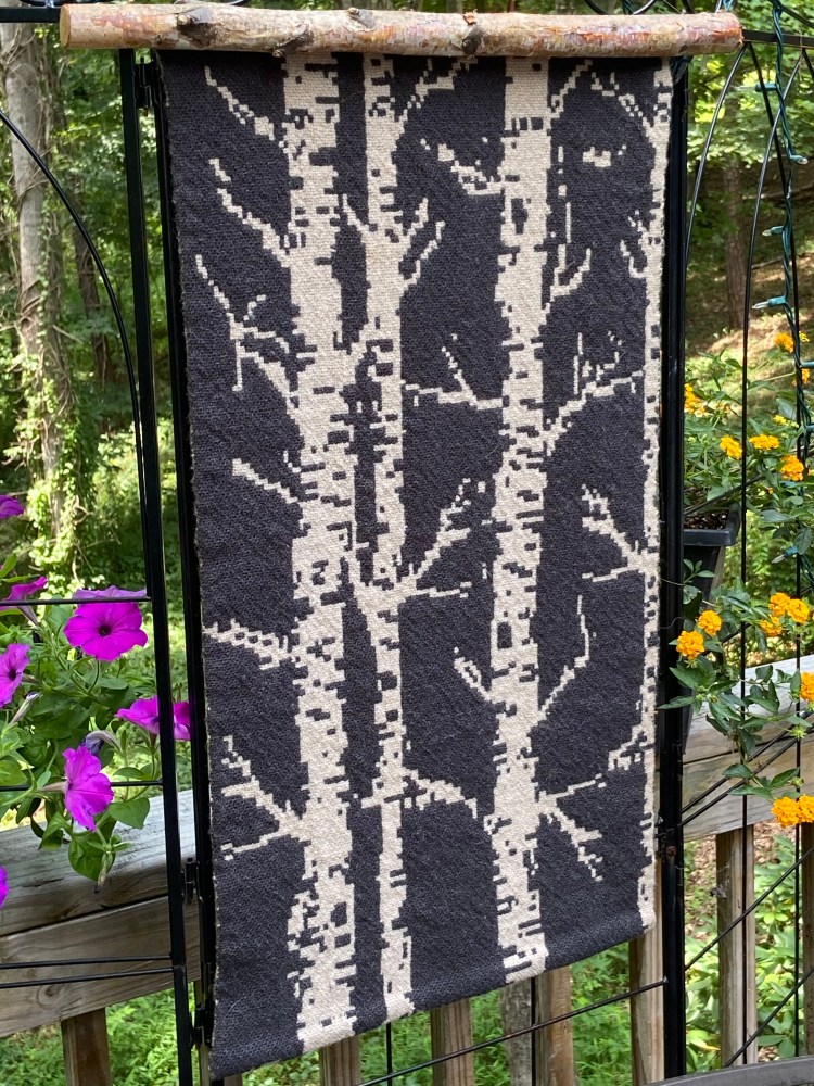 Aside from tapestry, my weaving focus has been on designing and weaving banners and prayer flags in double weave pickup. Recently I’ve been experimenting with mixing felting with weaving. We will see where that takes me. My fiber-enabling husband, David, our beagle Maudie, and I live about an hour west of Chicago, where I belong to a number of weaving and spinning guilds.